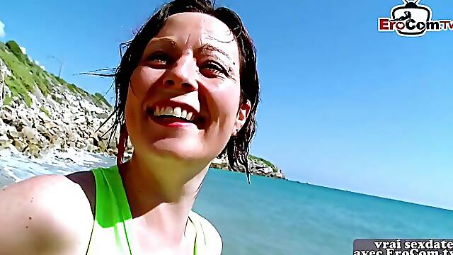 French woman is having casual sex on the beach with a younger guy she has just met