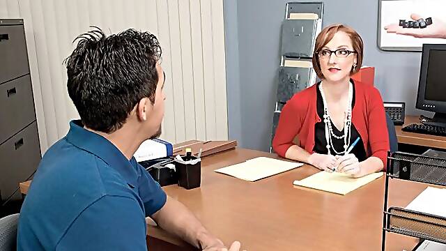 Teasing redhead milf with glasses and huge boobs sucks cock
